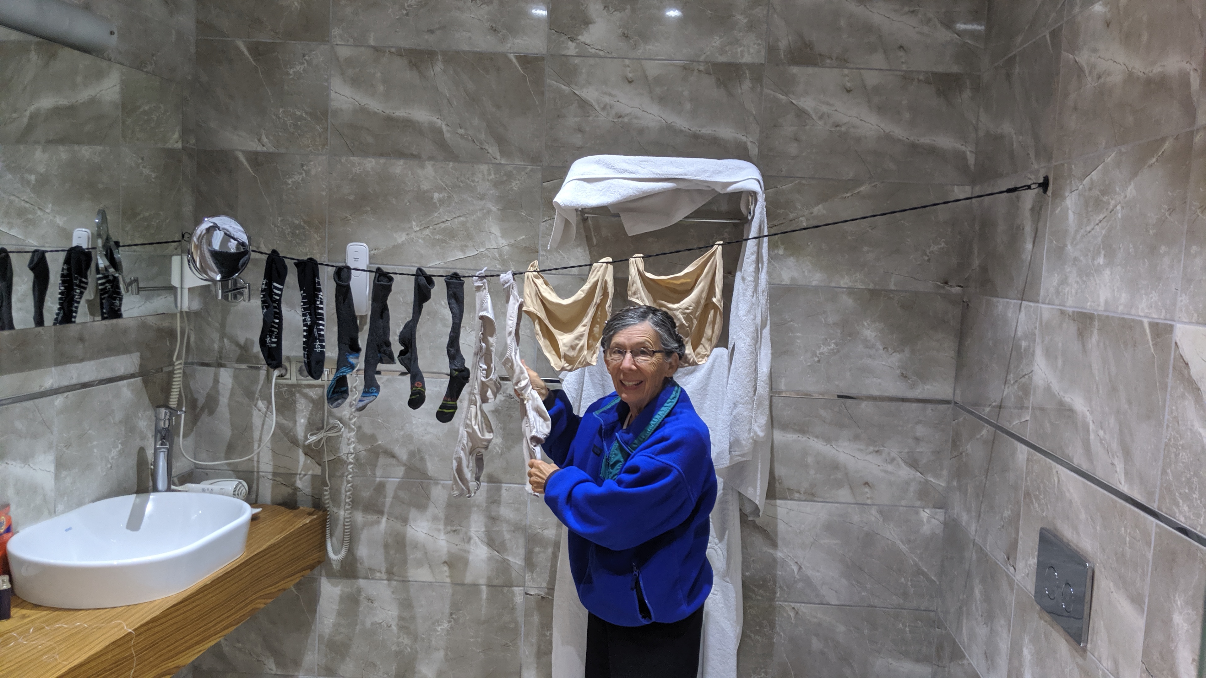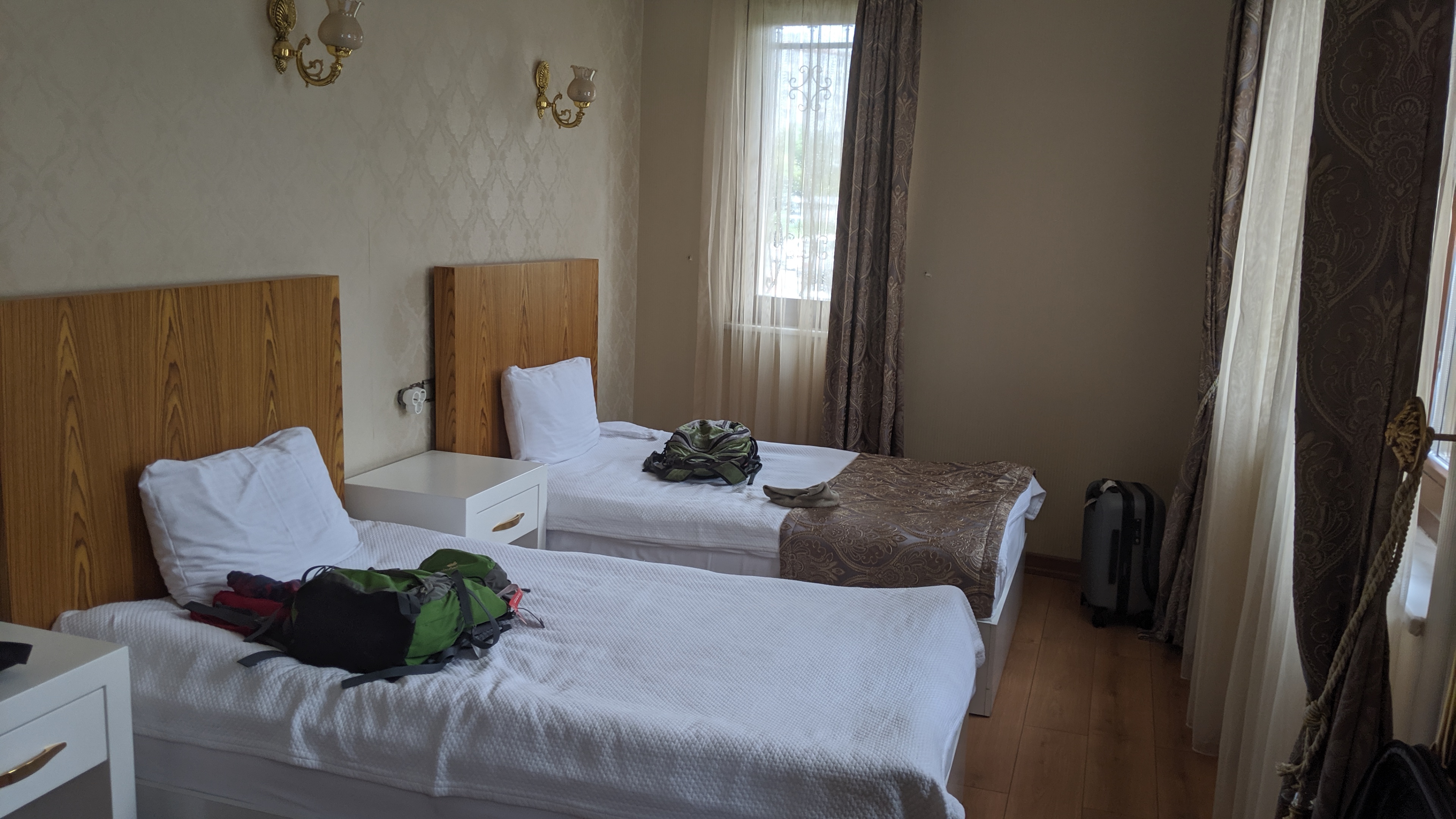 In Kayseri the travelers stayed in Setenonu 1892 Hotel, a very fancy hotel in the center of the city. They had two rooms, with three beds this time. Nancy used the very fancy hotel bathroom for her laundry, a humorous juxtaposition. After settling in, the travelers had a quick dinner within walking distance. The waiter and restaurant owner spoke no english. It continued to rain very hard.
