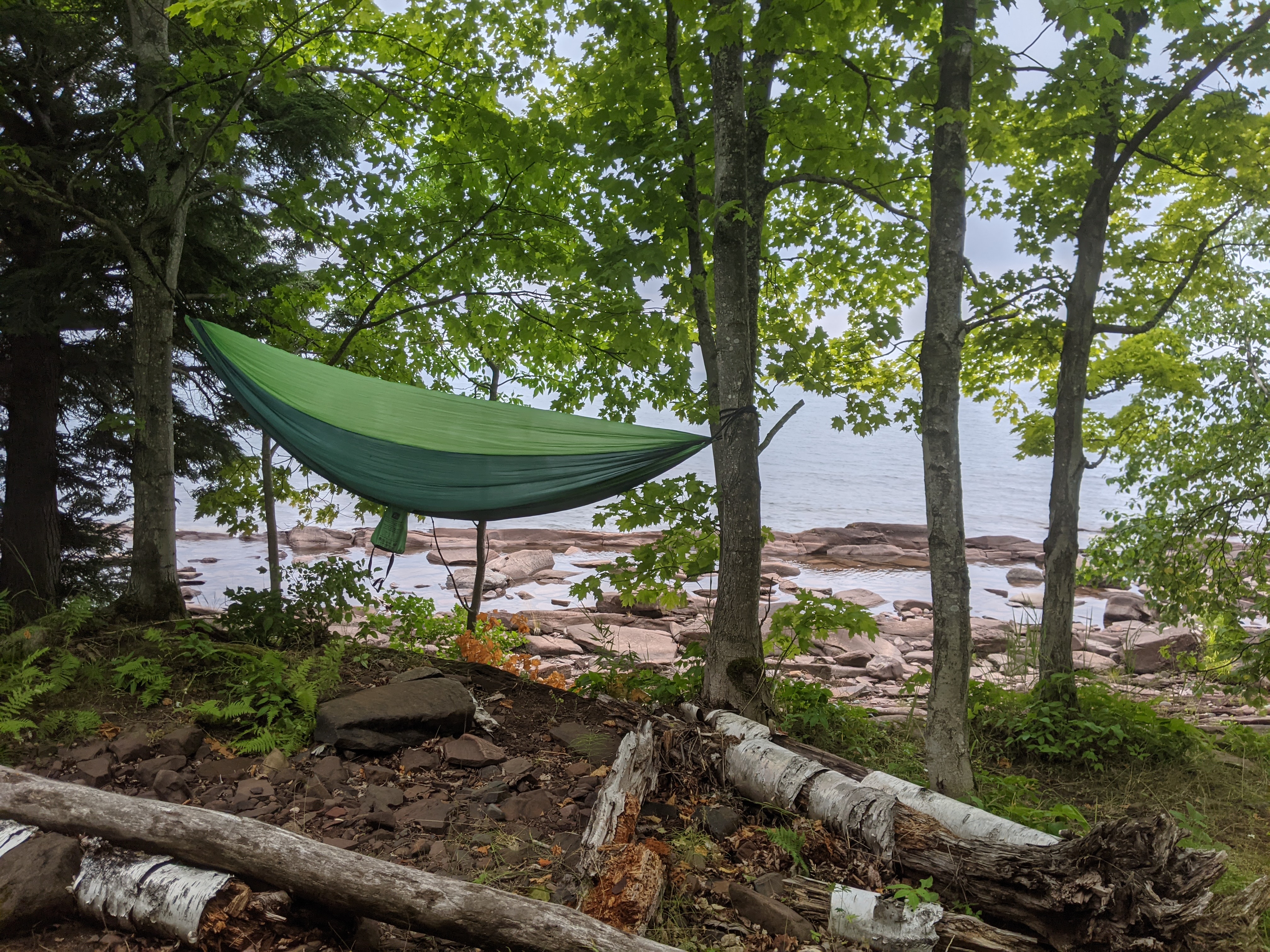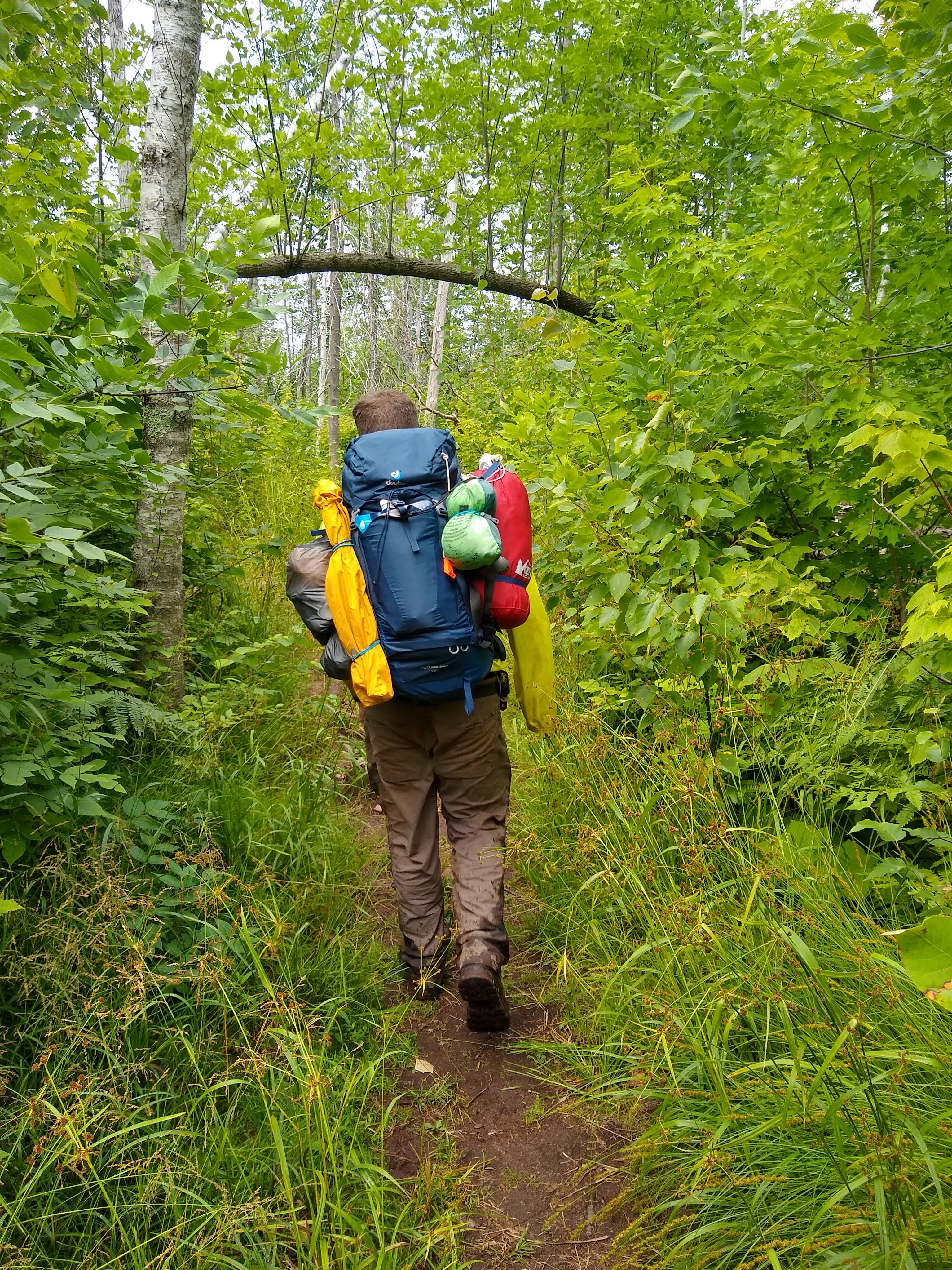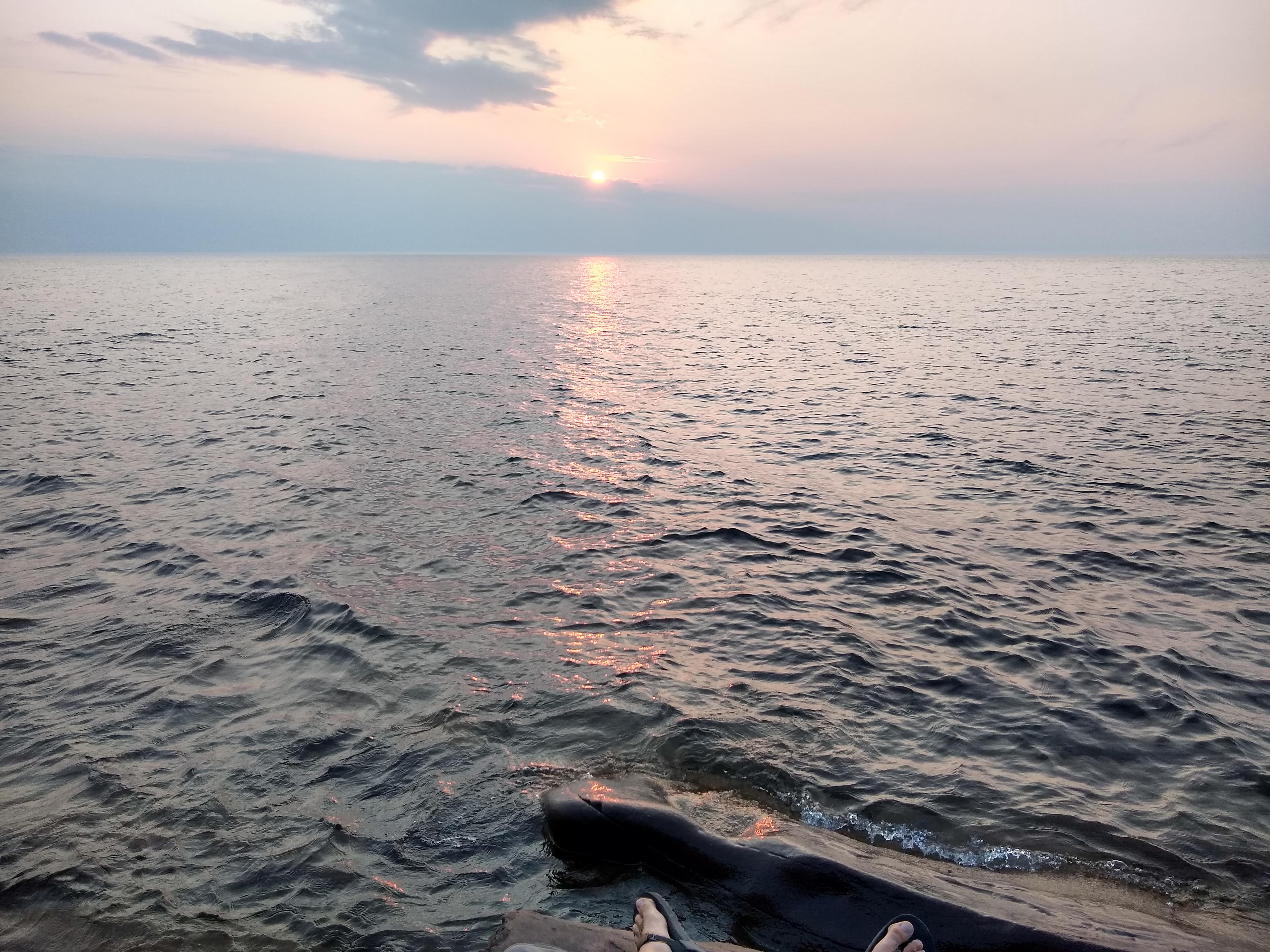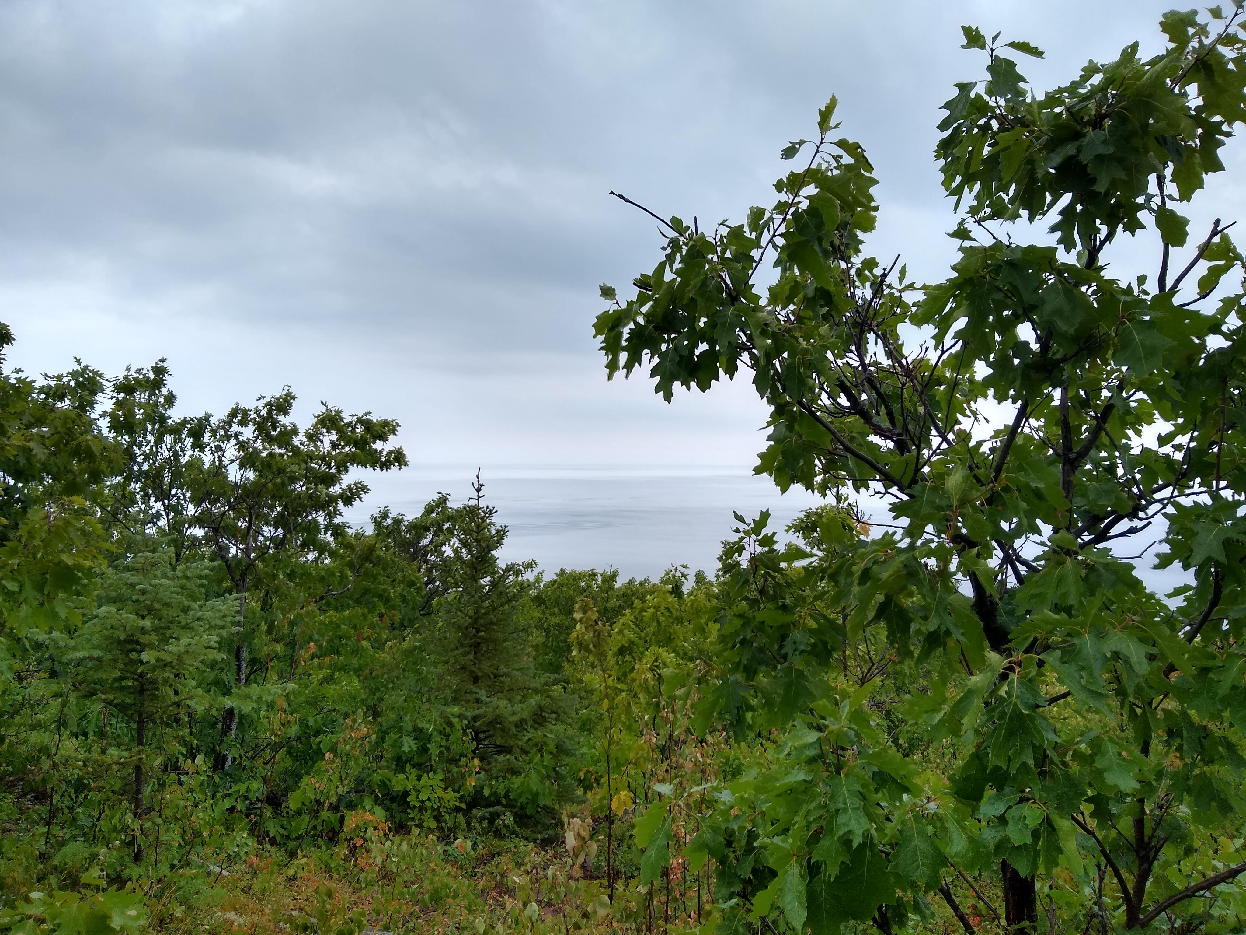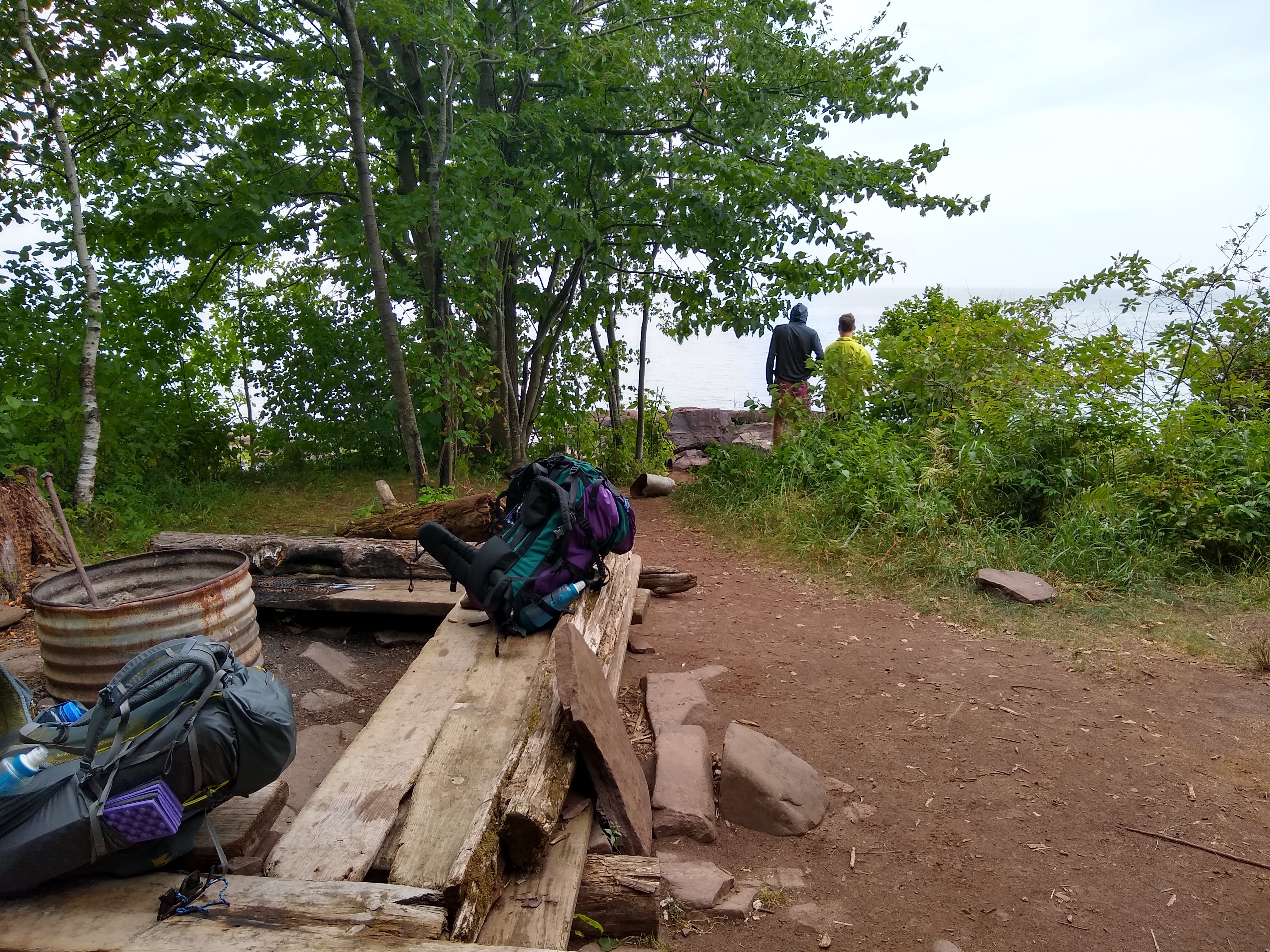 Once we made it back to the parking lot it was raining very hard. We decided to drive the the short distance from the Lake of the Clouds parking lot to the Lake Superior trailhead. We started our multi-day walk in the rain, headed towards lake Superior. By the time we saw Superior the first time it was calm. We were able to make it down to the water for lunch.