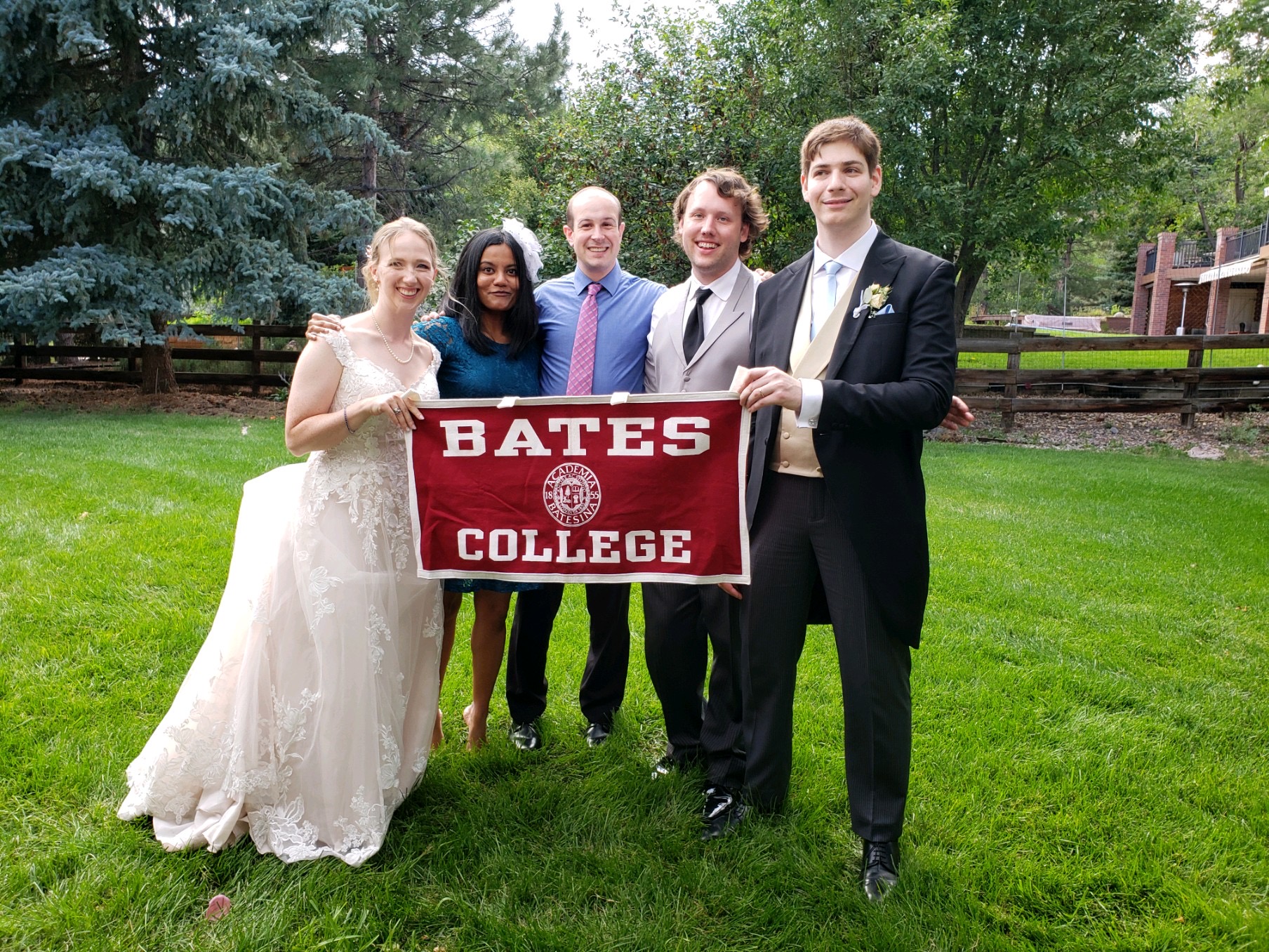 Kendall, Amrita, Kevin, Blaise, and Felix hold the Bates banner at the reception.