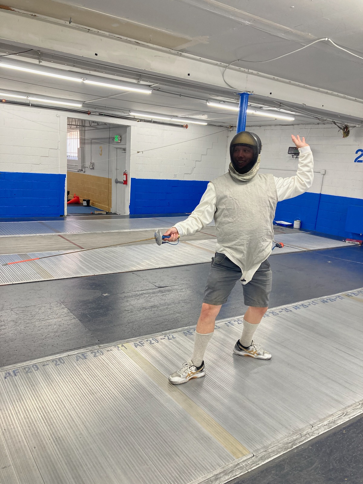 Blaise prepares to lose to Felix in a friendly fencing match.