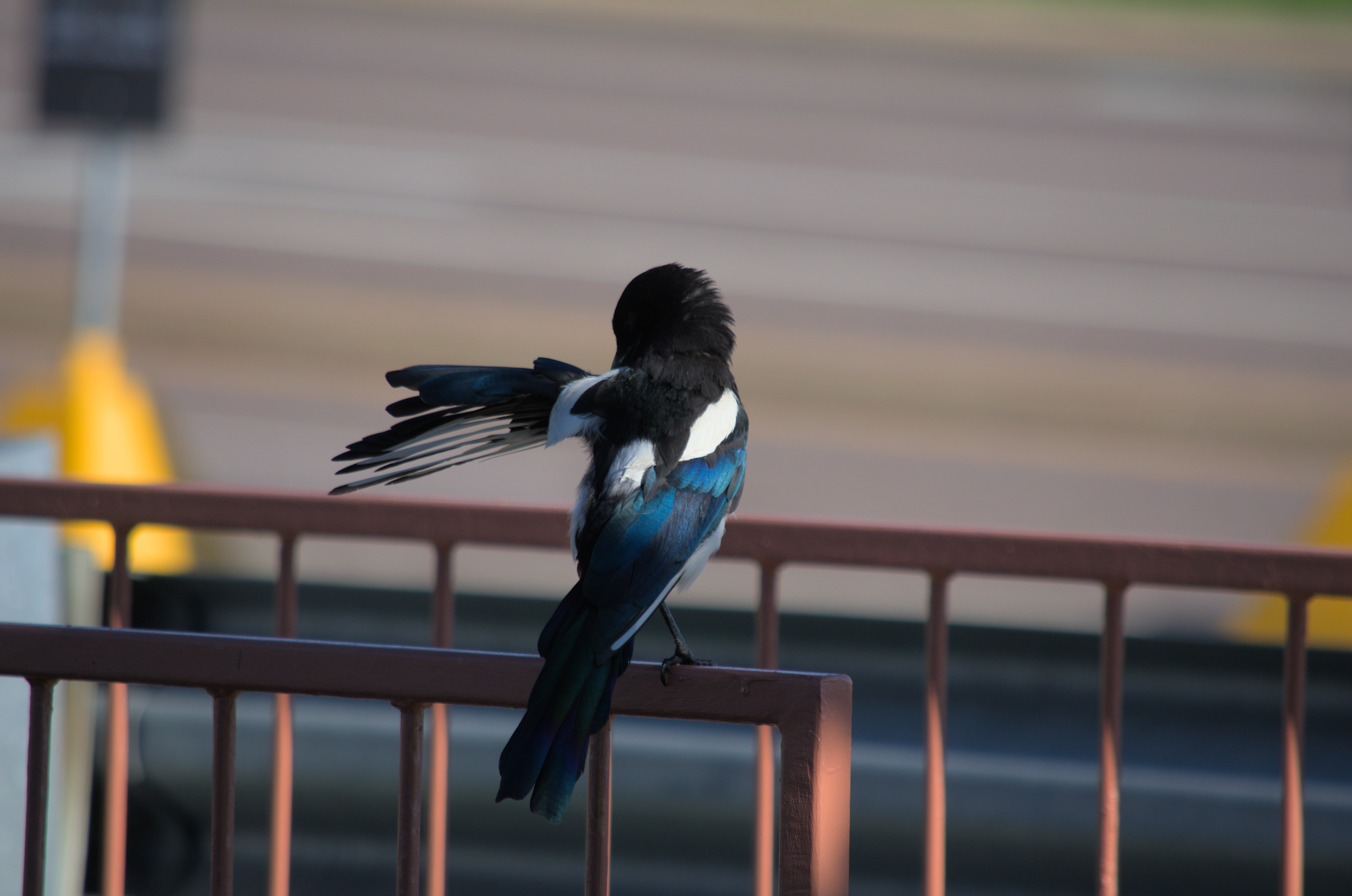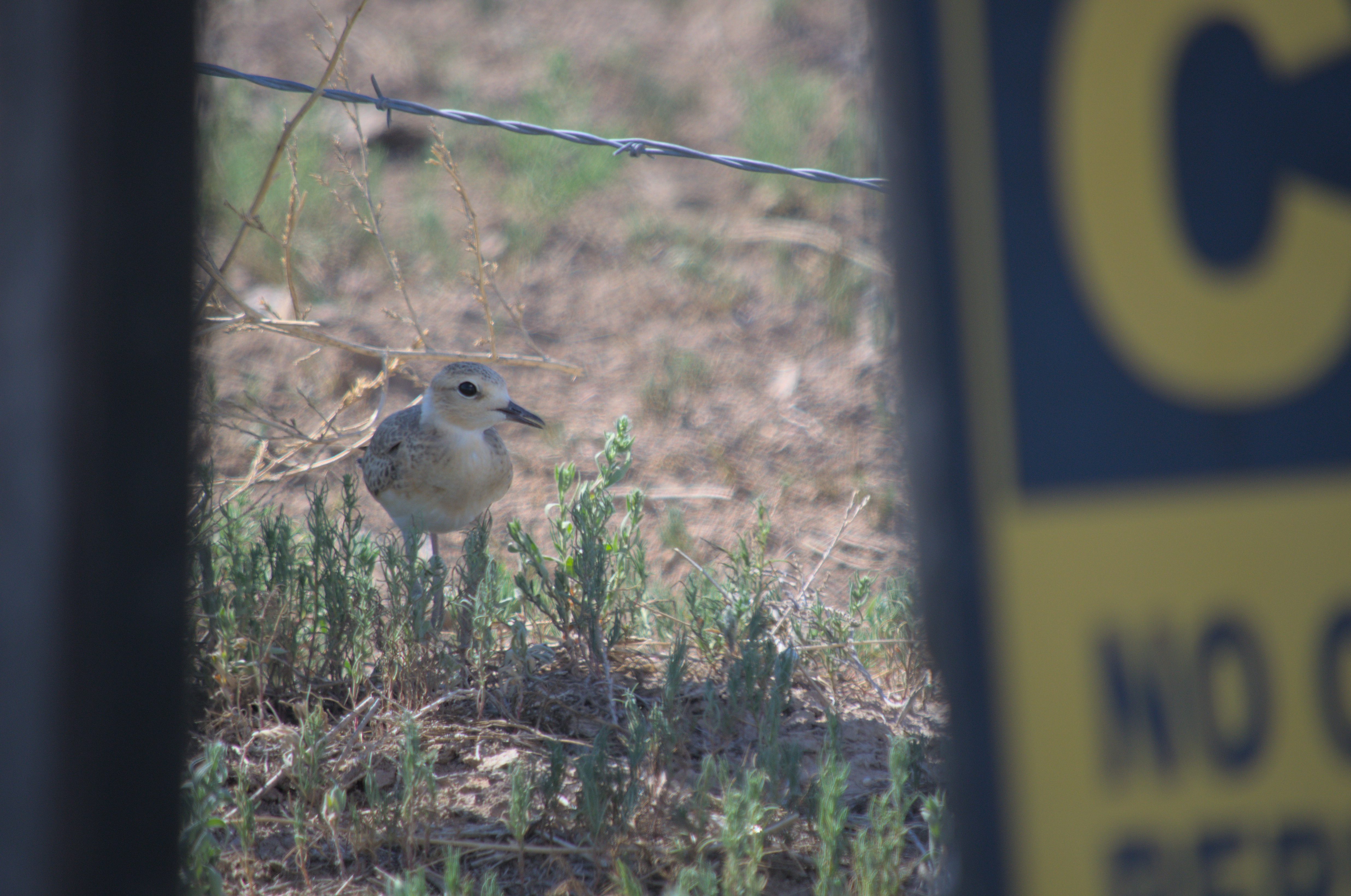 A mountain plover, rare bird that we were very lucky to see. It is taking shade near a fence post and signage.