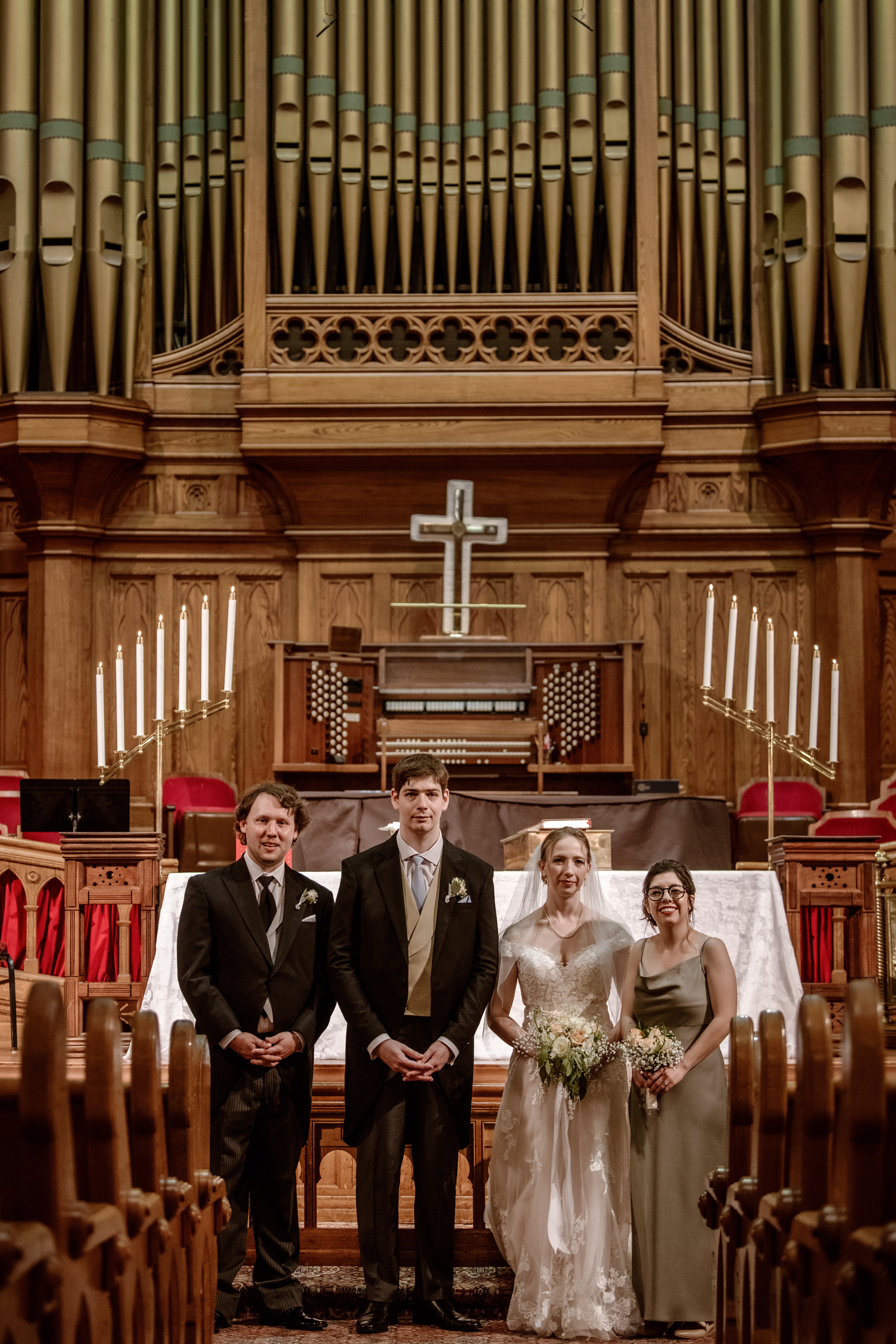 Best man, groom, bride, and bridesmaid.Kevin and Blaise pose in the church after the wedding ends.