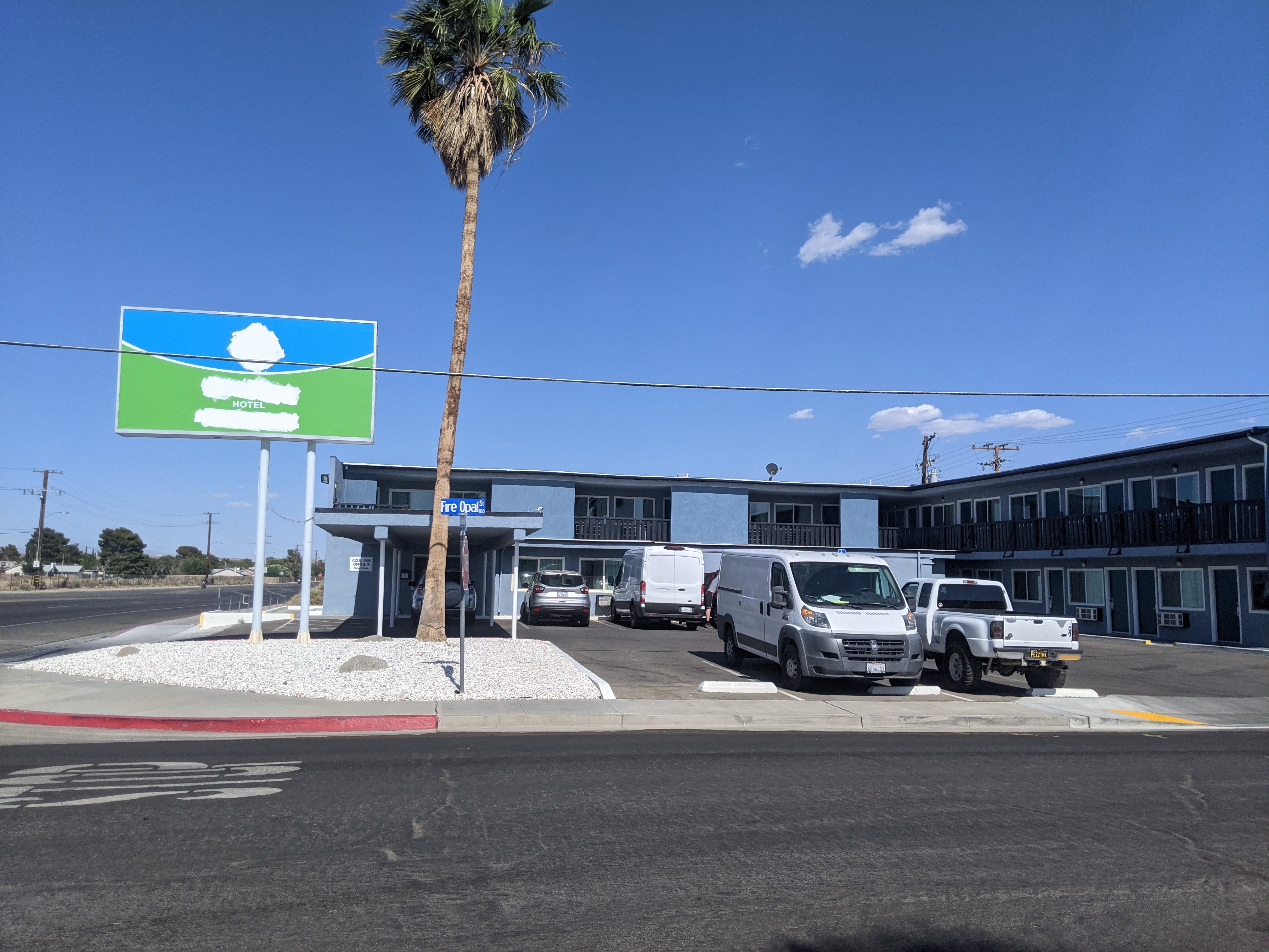 Leaving Sequoia, Tyler and Blaise traveled to a hotel in Ridgecrest CA for the night. East of Sequoia felt like the beginning of real desert. Ridgecrest is a funny little town, and the pair were able to get supplies at WalMart and a meal at Denny's. The hotel was a little sketchy, including a painted-over sign.